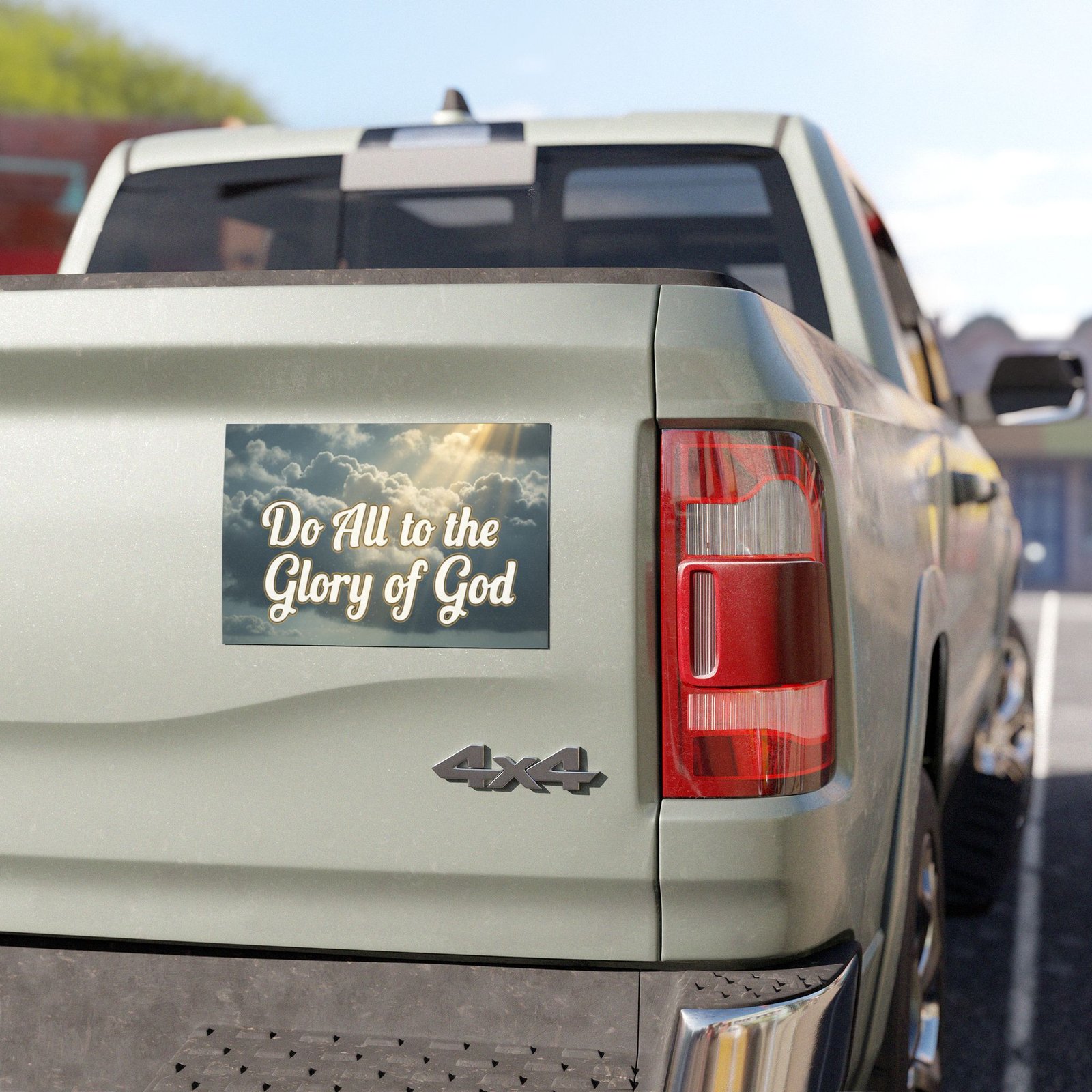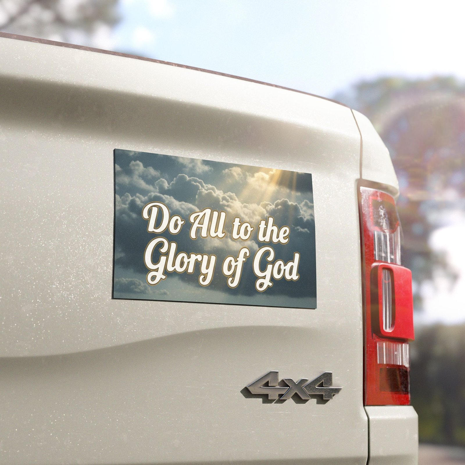 A quiet, faith-filled reminder you can carry with you. This vinyl car magnet features a soft sky scene with sunbeams breaking through clouds and the uplifting script, “Do All to the Glory of God.” Stick it to your car, toolbox, or church bulletin board to bring a moment of calm and encouragement into your day. The matte white base keeps colors gentle and understated so the message reads clearly without glare. Built for everyday life — rain or shine — it holds firm and looks like it belongs wherever you place it.